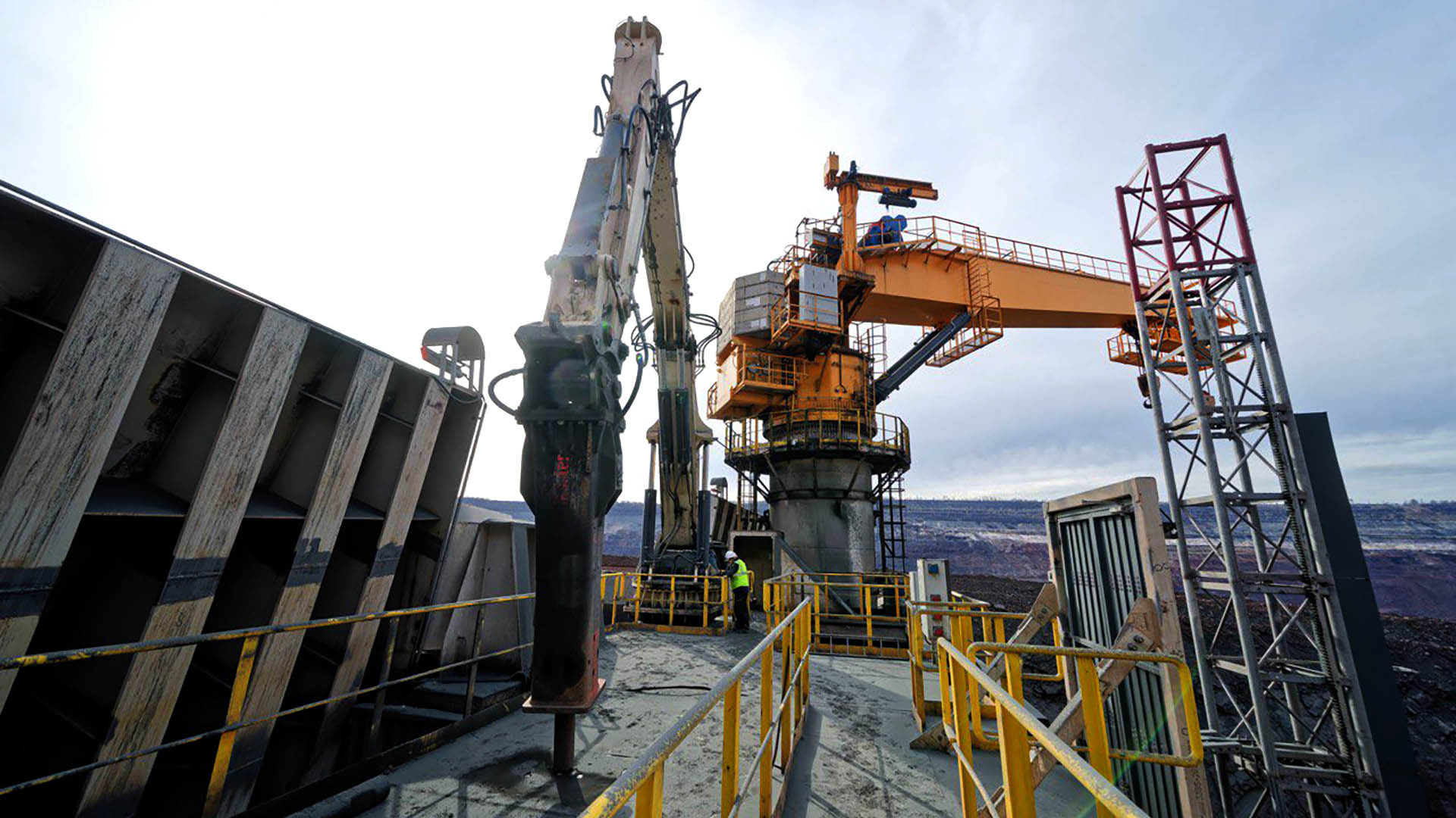 The Impulse Boom Systems team developed and successfully implemented a unique three-arm Impulse DX1400R manipulator with a three-ton hydraulic hammer for the continuous-flow technology (CFT) at a large mining and processing plant. The plant required efficient equipment for breaking up oversized ore in a large receiving bin equipped with a T-shaped breaker beam. Our engineering team began developing this solution in 2021, winning a tender where participated some well-known Western companies.